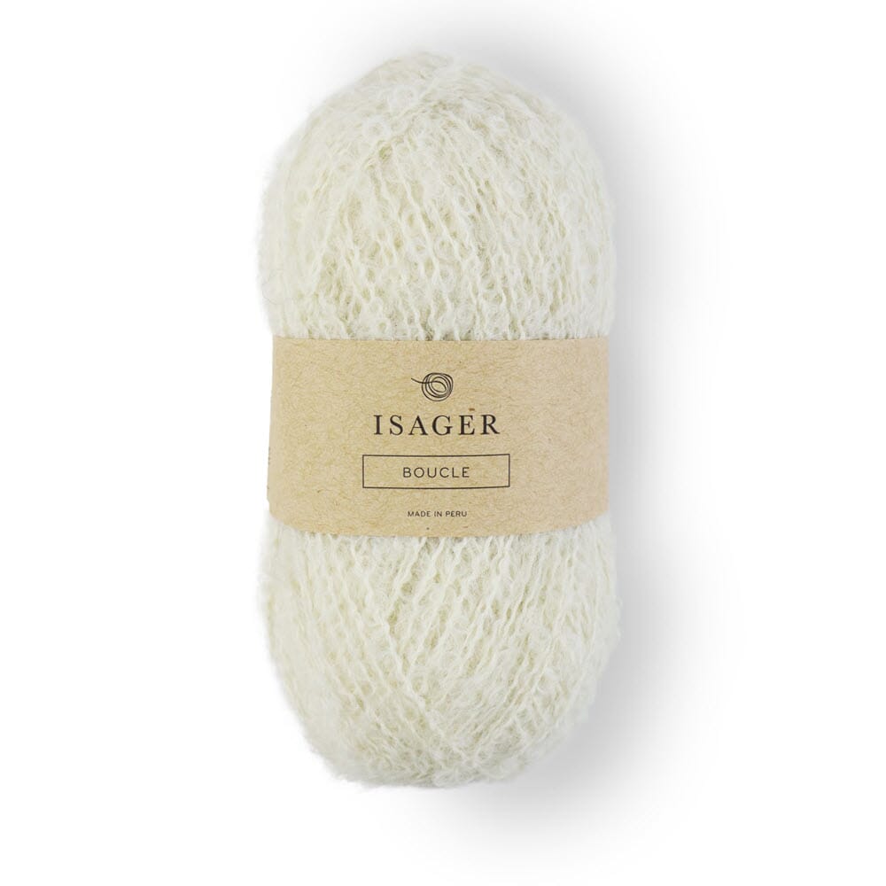 ISAGER BOUCLÉ fungerer best når det strikkes sammen med et annet garn, og gir en spennende og litt opphøyd effekt i forhold til glatt garn når det strikkes sammen. Derfor er det fint å bruke boucle som striper eller som et mønster i dobbeltstrikk eller jacquardstrikk. I strukturstrikk som f.eks.ribbestrikk vil det være vanskelig å se mønsteret.