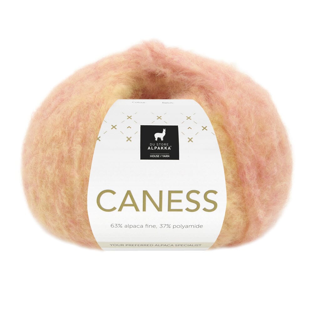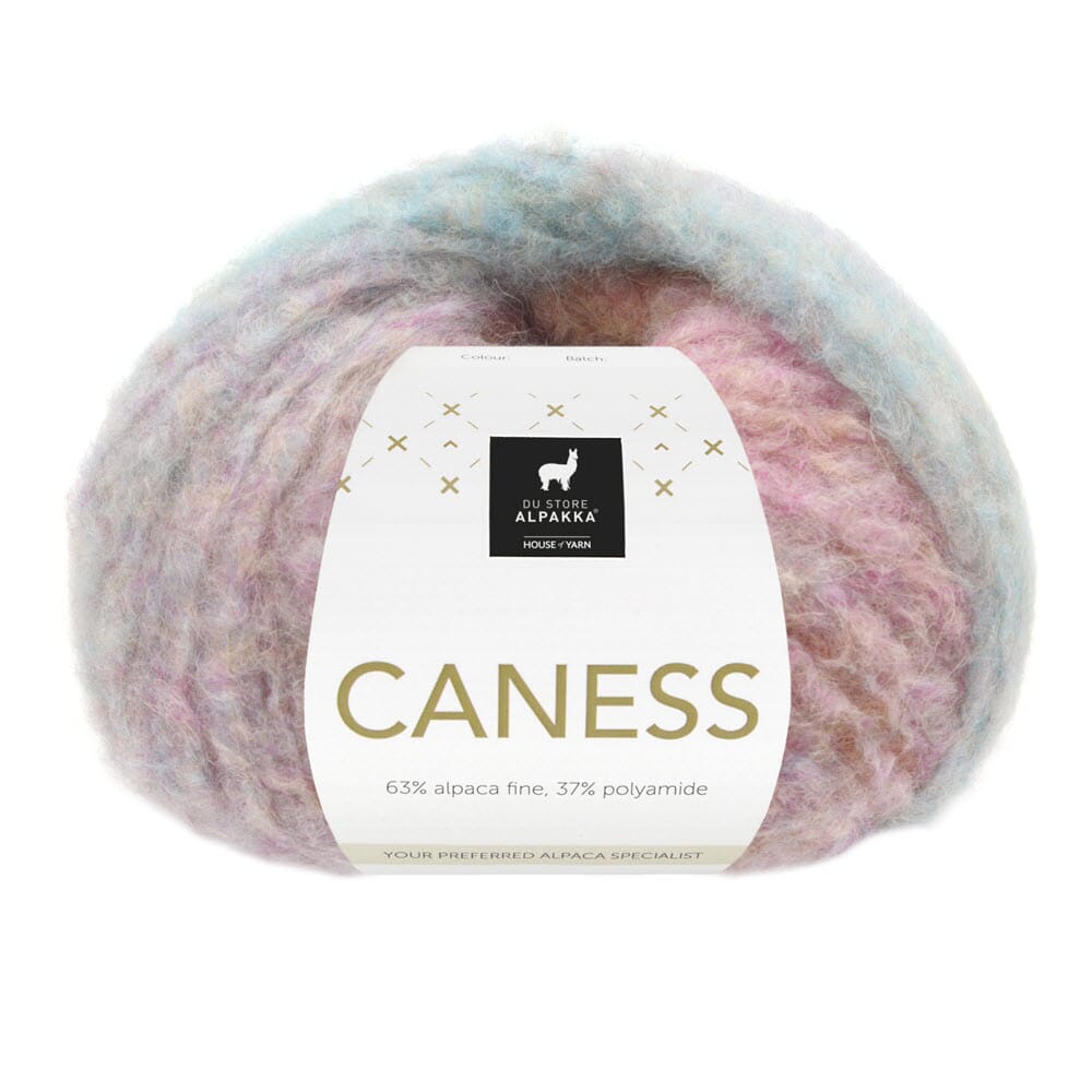 CANESS er et særs luftig garn der alpakkafibrene holdes sammen av en tynn kjerne av polyamid. Det gir fnugglette plagg som er en drøm å ha på seg, og som holder seg flott i bruk. En favoritt hos mange. Det harmoniske fargespillet gir unike uttrykk med plagg der f.eks ermene kanskje er ulike i fargen. Luen kanskje har en annen farge i oppbretten enn på resten av luen. Dette styres etter hvor på nøstet man begynner. Garnet er svært drøyt, og 2-3 nøster holder til en genser. Egner seg til gensere, jakker og tilbehør, enten alene eller sammen med en følgetråd.