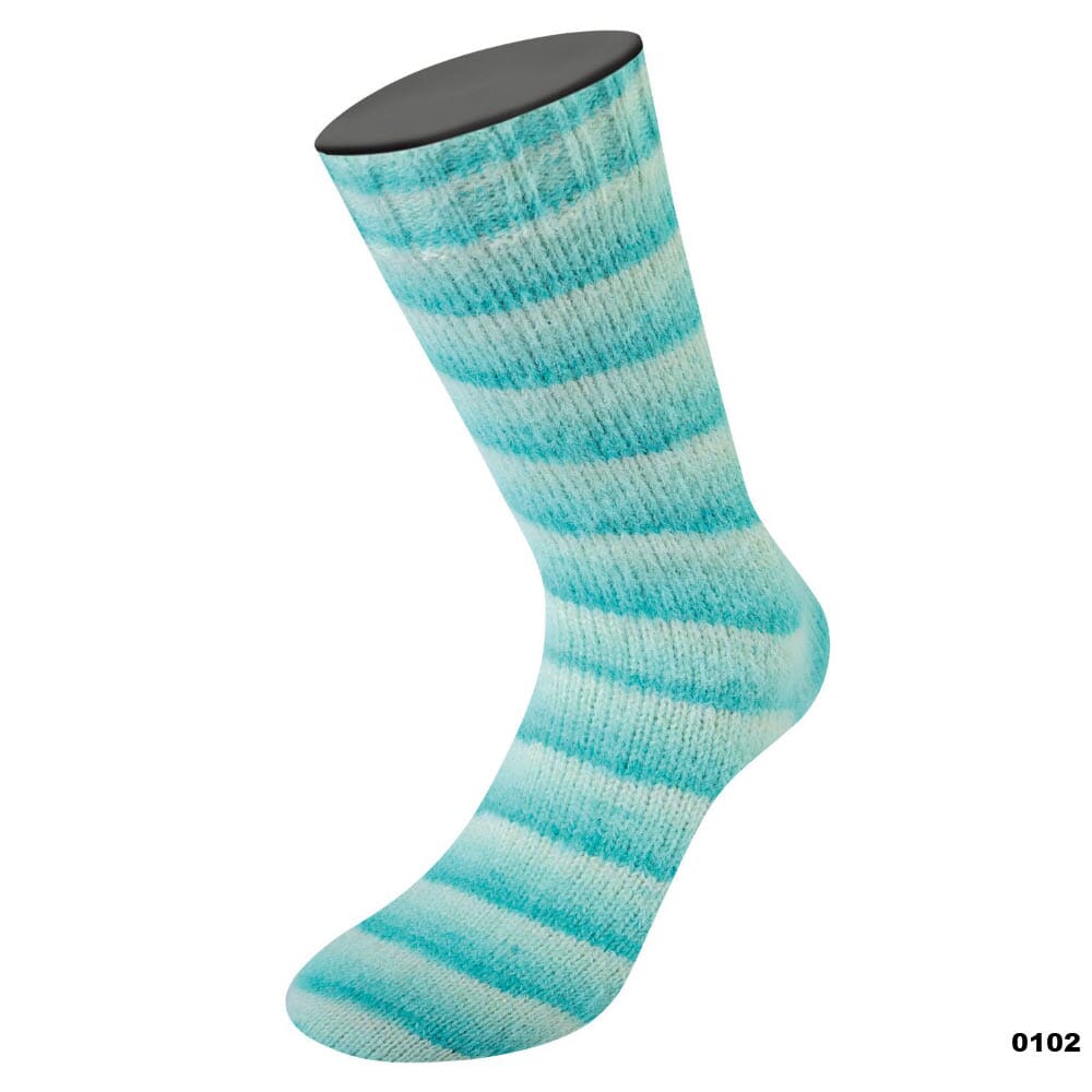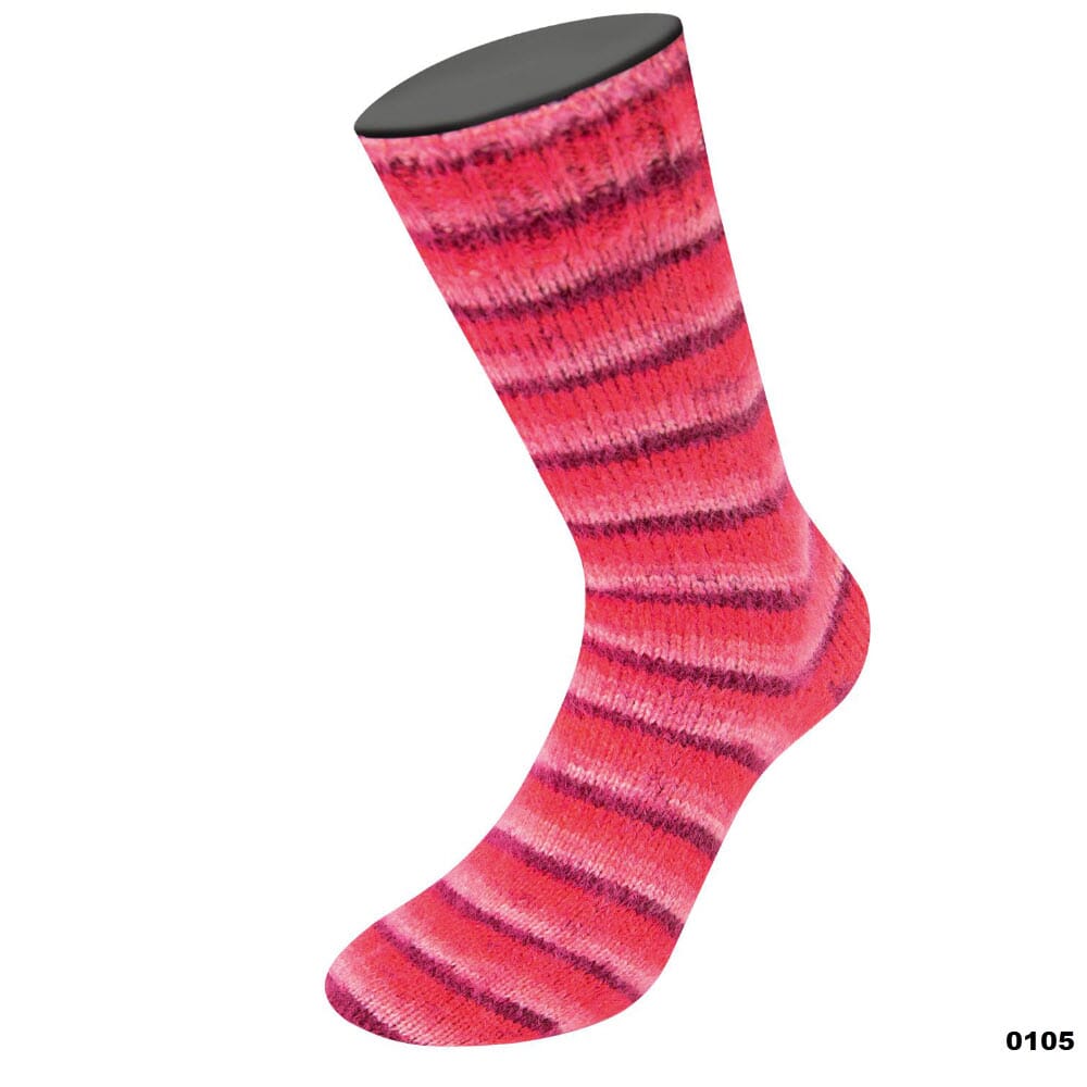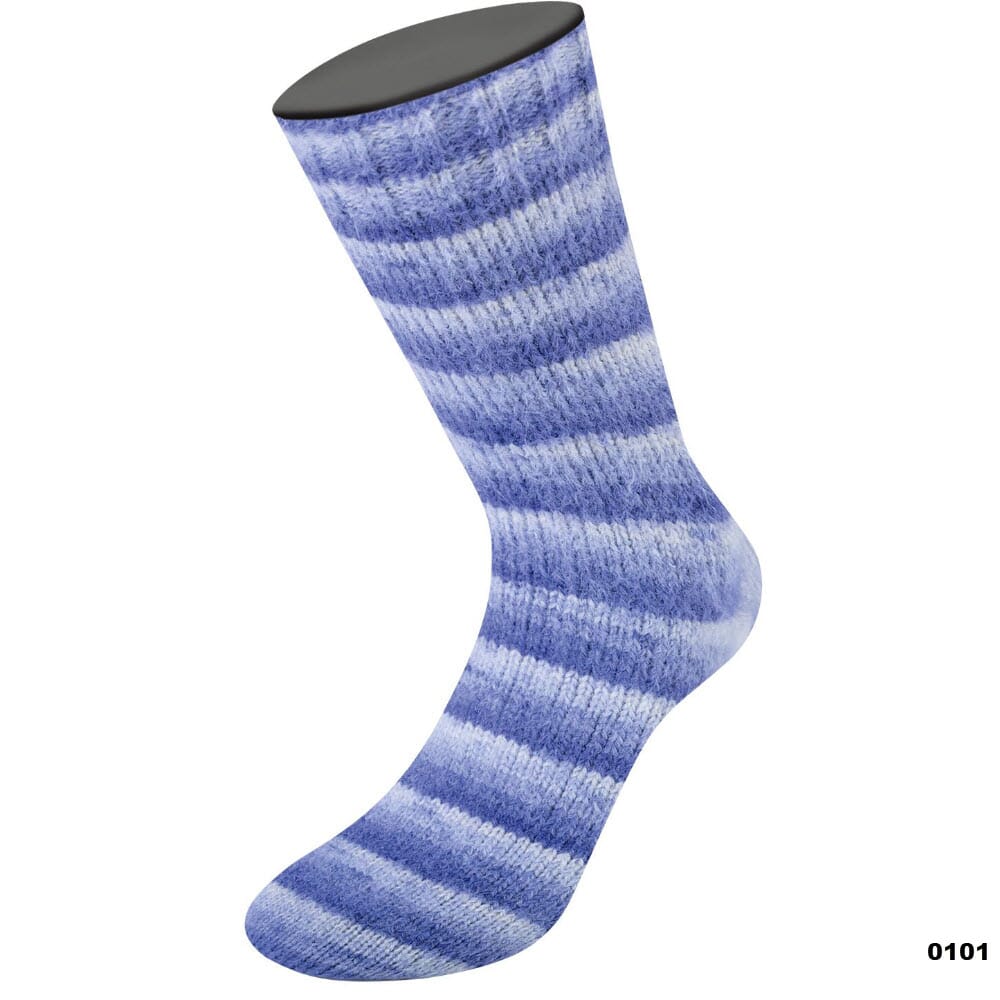 Mykt og fluffy garn i merinoull i fargerike striper med nylonforsterkning som gjør det perfekt å strikke sokker av.