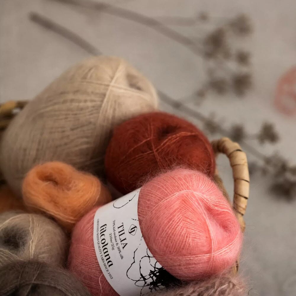 Tilia er et luksuriøst garn, spunnet av 70% kidmohair og 30% morbærsilke. Teknisk sett er Tilia et tynt kamgarnsspunnet, børstet garn. Mohair har alle de gode egenskaper, vi kjenner fra ull. Det er varmt, vakkert og kan absorbere fukt, hvilket gjør det behagelig å ha på. Mohairfibrene er, sammenlignet med ull, blanke og en smule sterkere. Silke har gjennom årtusener vært en av de mest ettertraktede tekstilfibre. Den er blank, pen, stærk og utrolig behagelig å ha på. Kombinasjonen av silke og en sky av mohair er noe av det lekreste og mest luksuriøse garn, man kan ønske seg å strikke med.