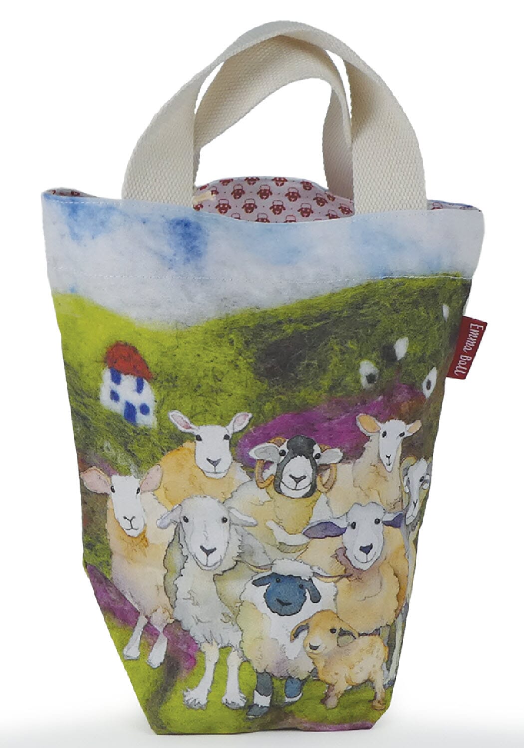 Vesken er i solid bomullsstoff med motiv av sauer, og foret med matchende stoff.
