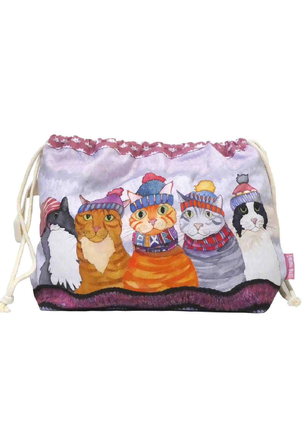 Prosjektpose i solid bomullsstoff med morsomt motiv av katter med fargerike hatter. Posen er foret med matchende stoff med kattemotiv. Den har snørelukking i toppen og stropp i siden til oppheng.