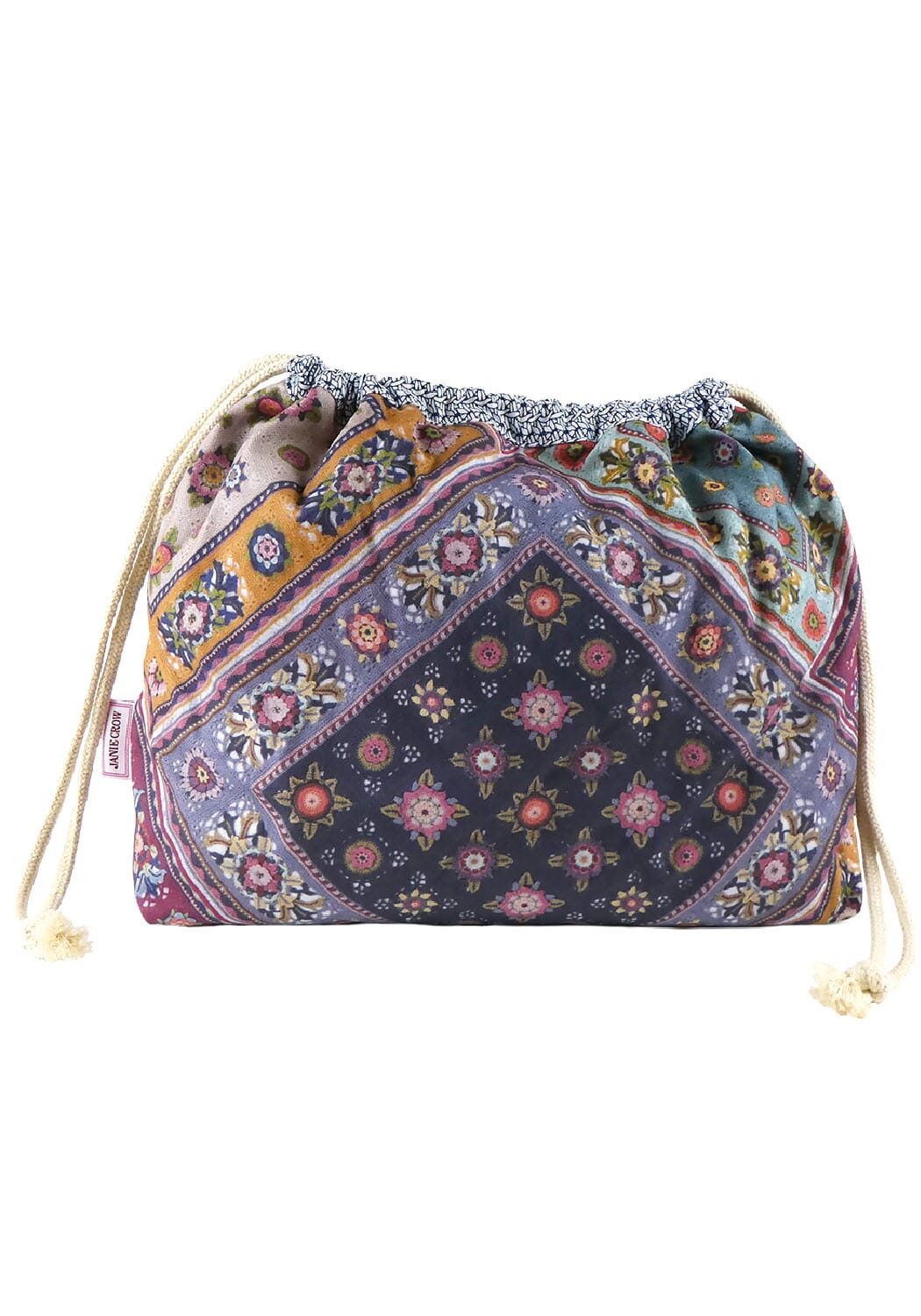 Prosjektpose i solid bomullsstoff med koselig motiv av heklede ruter. Posen er foret med matchende stoff med motiv av heklemasker. Den har snørelukking i toppen og stropp i siden til oppheng.