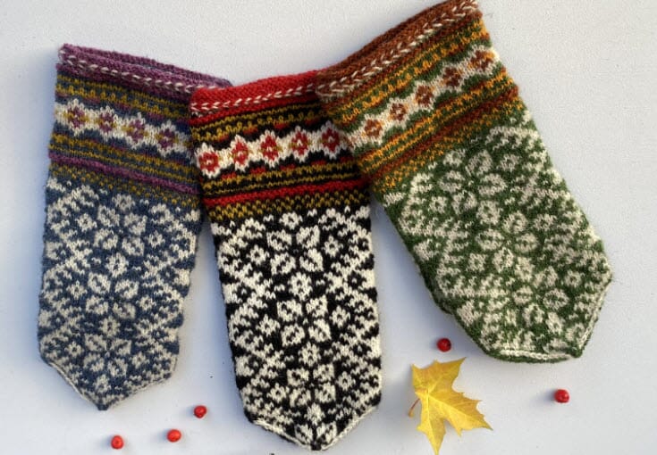 Kronbladvotten har en latvisk flette som er en tvebandteknikk. Mansjetten har et mønster hvor det benyttes totalt fire farger, men du strikker kun med to farger av gangen. Selve votten har mønster med to farger.