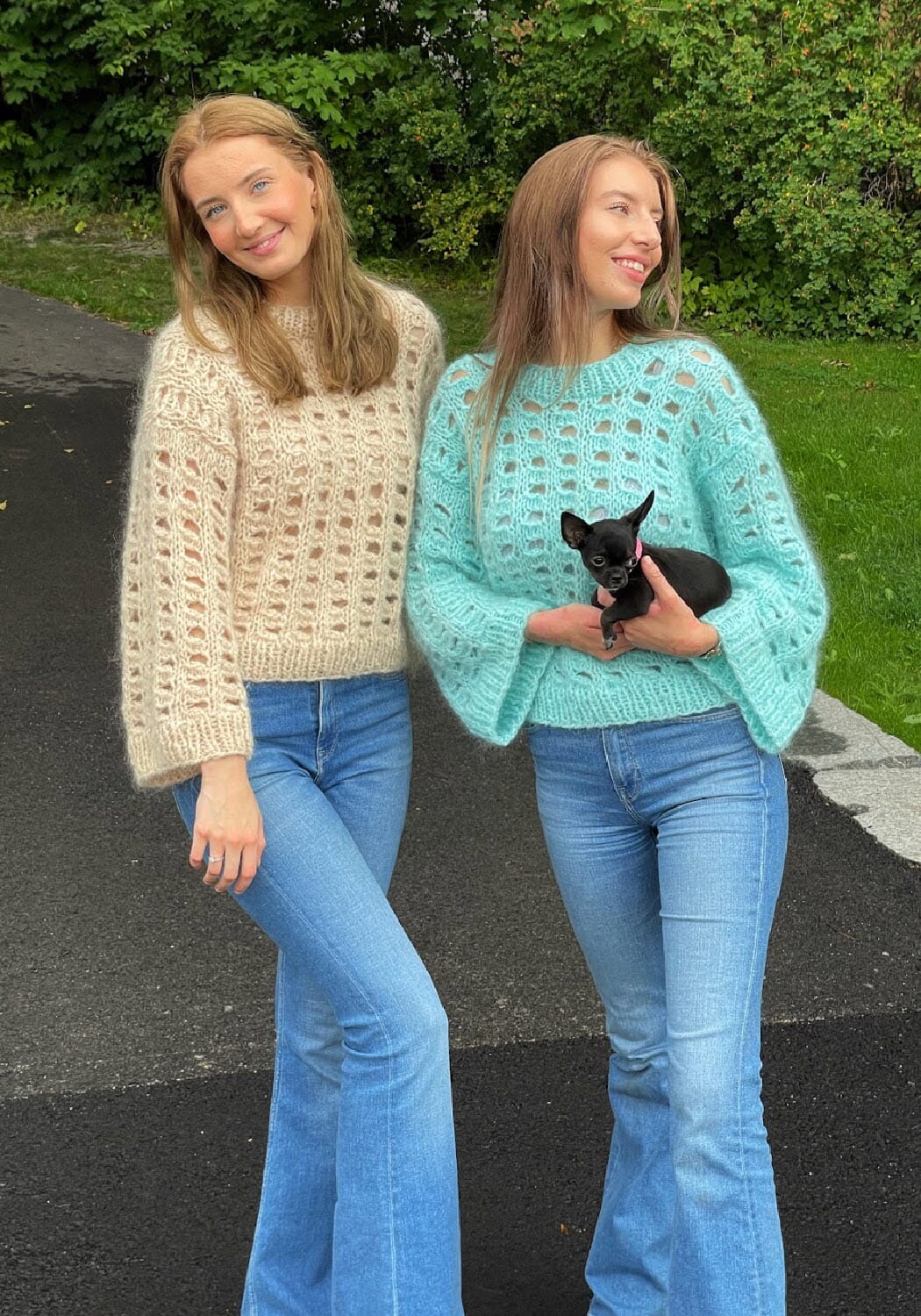Lindtein Air Genser er en trendy kort genser, med store huller. Genseren har vide ermer og rund hals. Ermelengden er tilpasset slik at den treffer rett over kulen på håndleddet. Løs i passformen. Sjekk mål for din str. Genseren kan lett forlenges, da må garnmengden justeres.