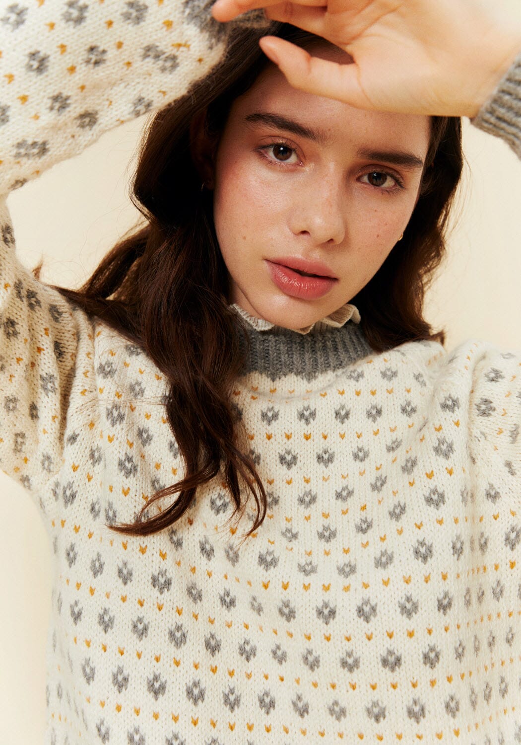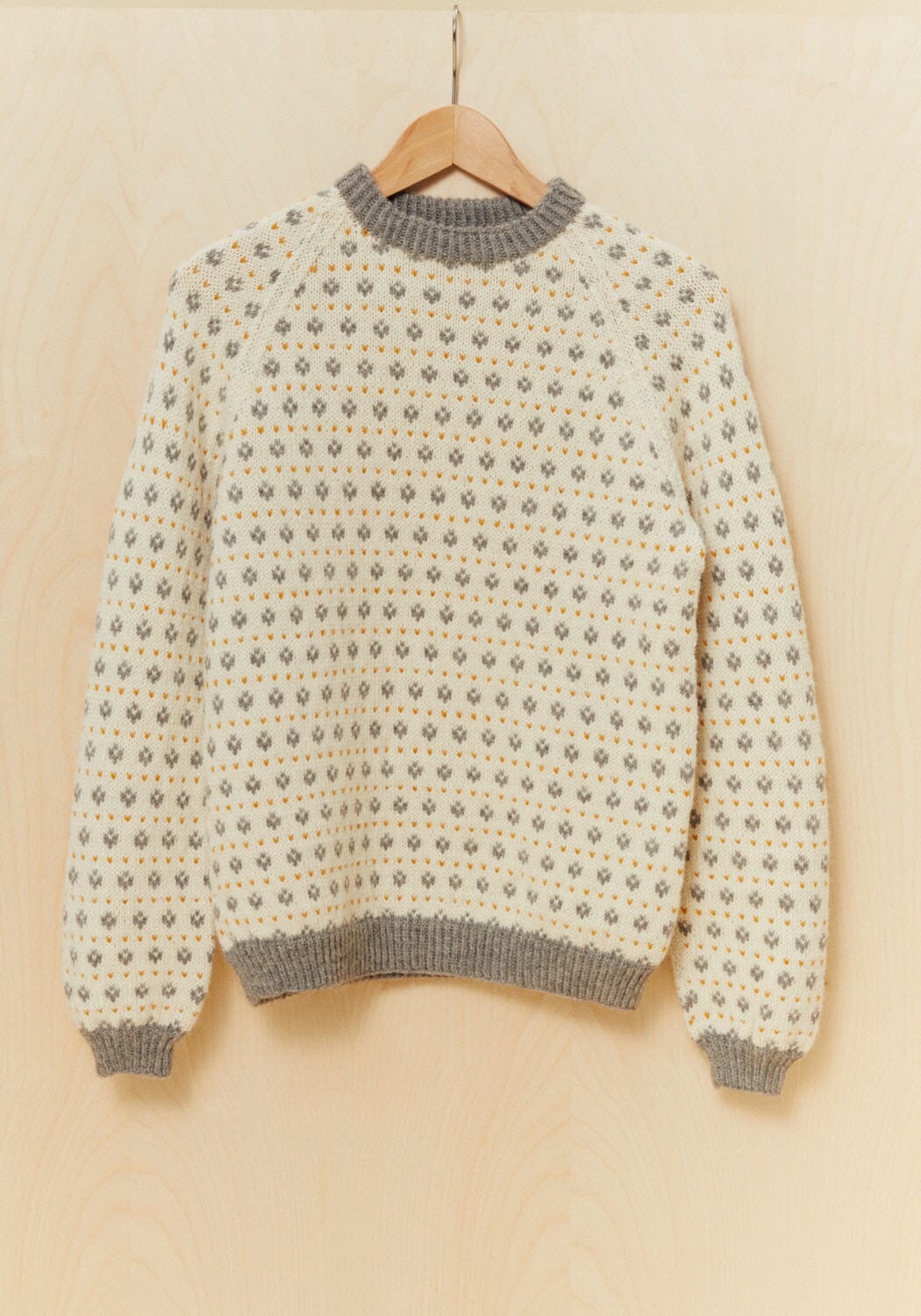 Blåbærgenseren er en småmønstret raglangenser i 3 farger som strikkes i det myke, deilige garnet Tumi. Tumi er en blanding av alpakka og ull. Genseren strikkes nedenfra og opp, med raglanfelling og ringning i halsen. Halskanten er strikket med vridde masker og er brettet dobbel mot vrangen.