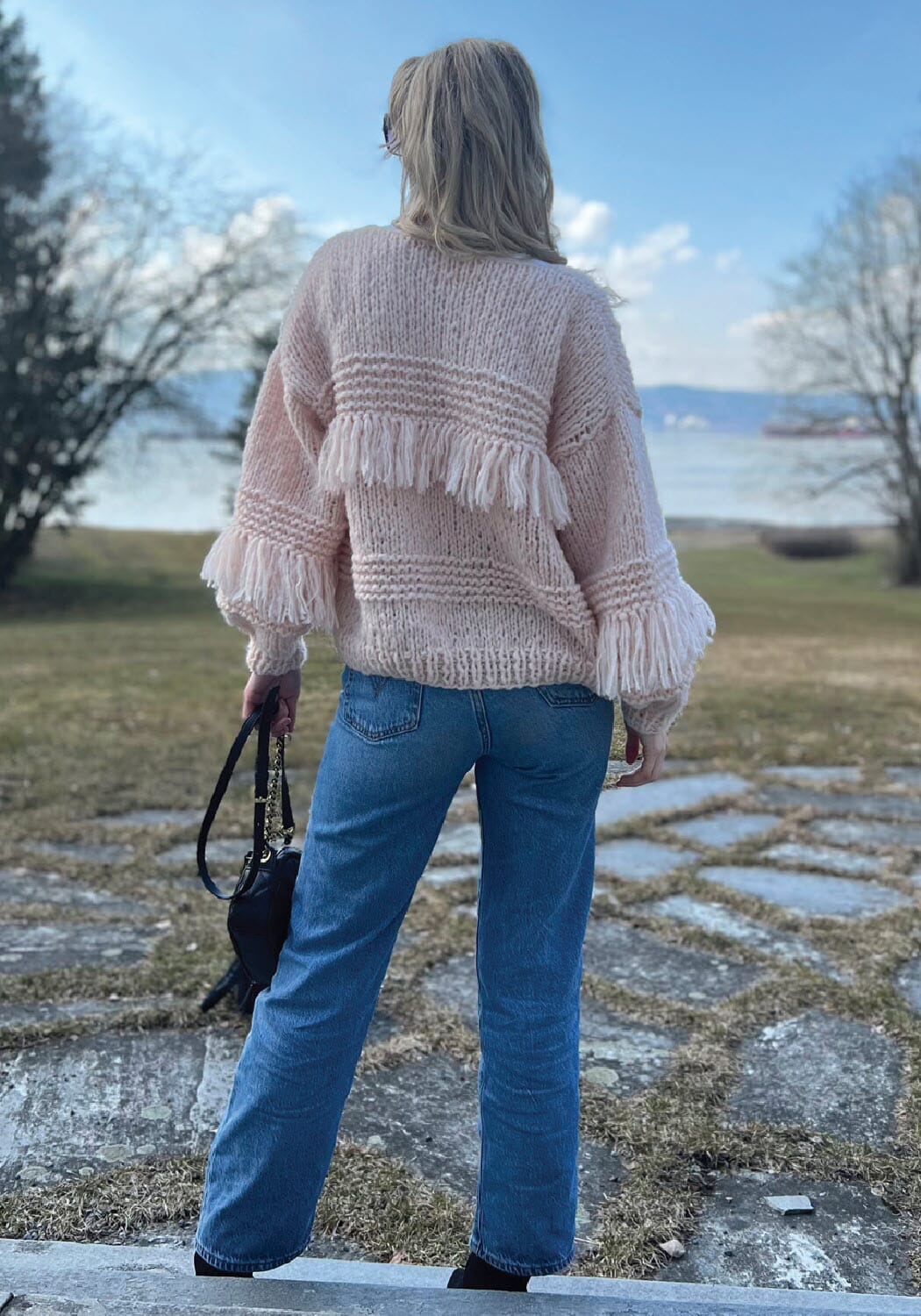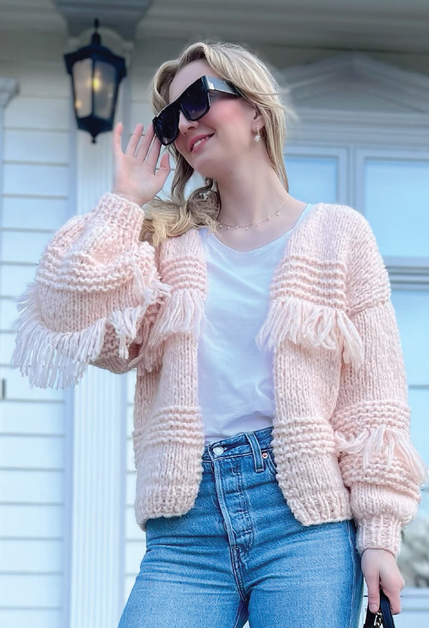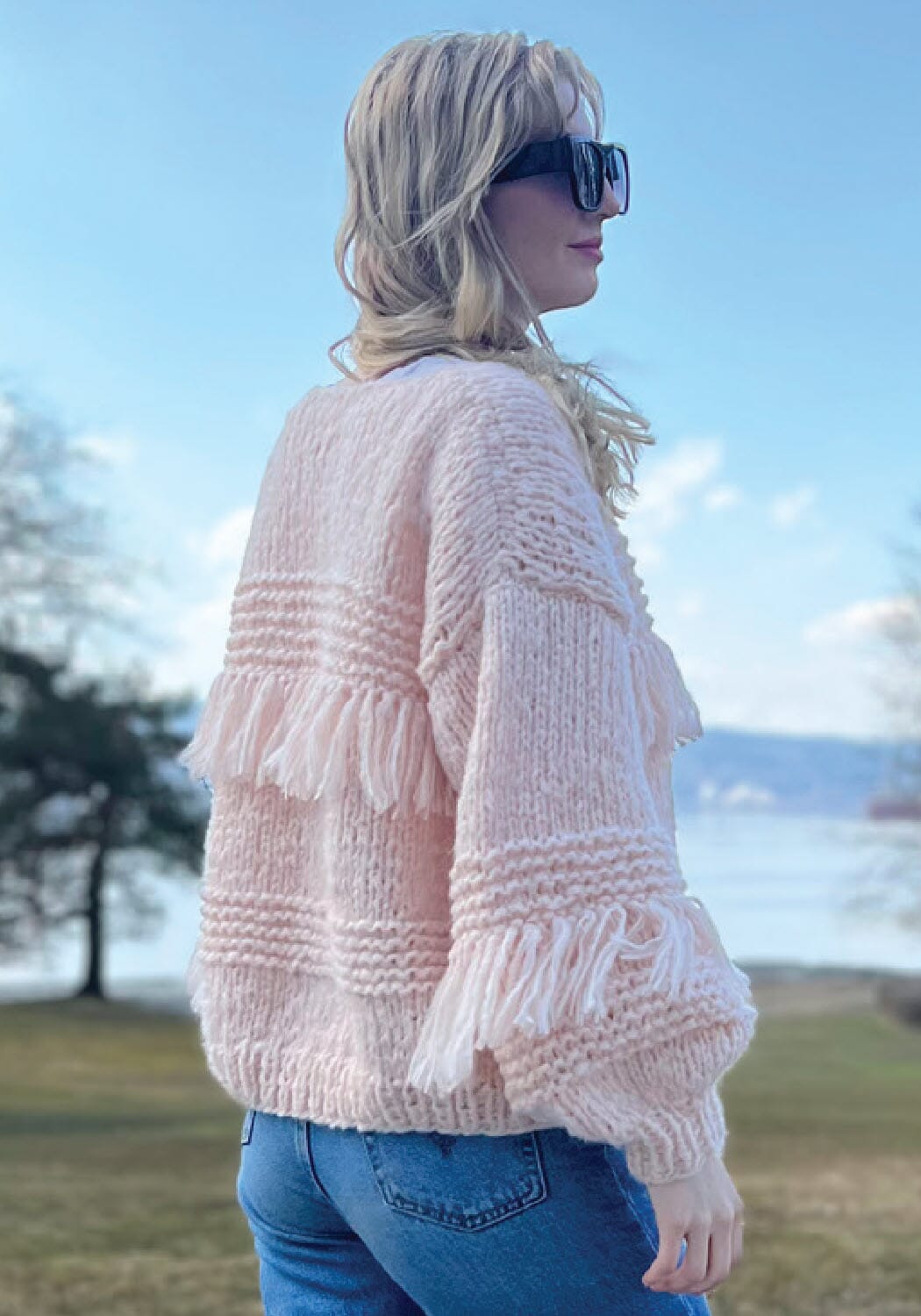 - Strikkeoppskrift på Comfy Fringe Cardigan i papirutgave (sendes sammen med garn i posten, ikke digitalt).