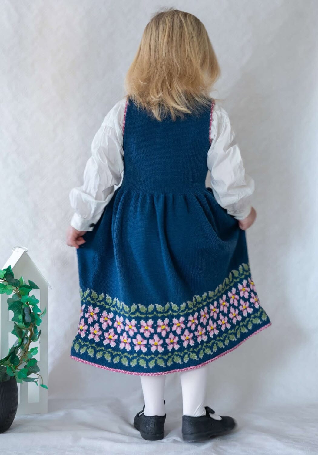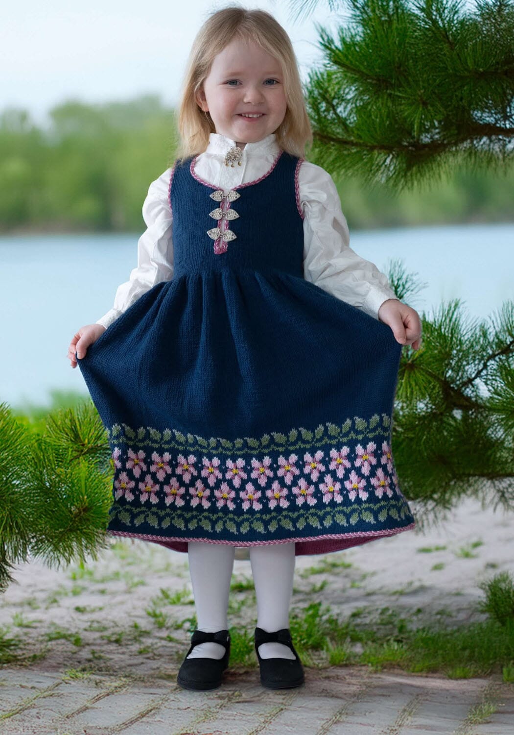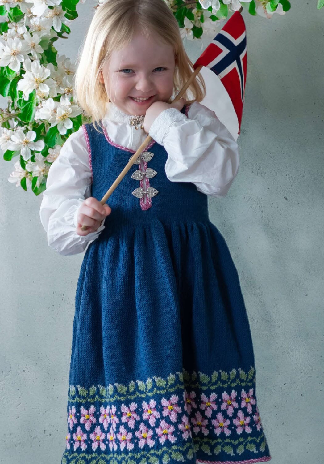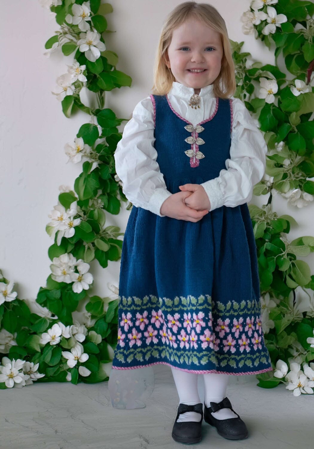 Epleblomst festdrakt til barn - en strikket bunad med mønster av epleblomster og blader på skjørtet som er inspirert av epleblomsten. Drakten strikkes nedenfra og opp. I midten av blomsten sys det på perler til slutt (kan sløyfes). Langs halskanten og splitten foran, rundt ermehullene og nederst på skjørtet strikkes det en latvisk flette. Det sys på hekter (følger ikke med i strikkepakken).