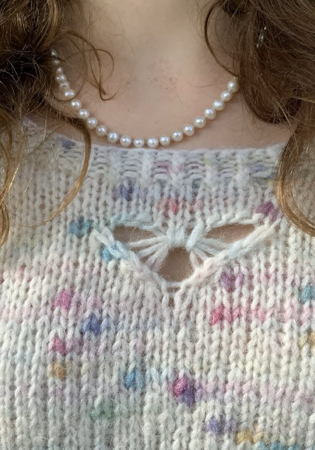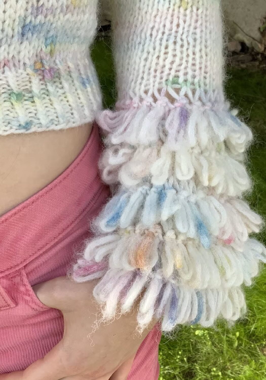 Genseren strikkes nedenfra og opp med raglanfelling. Løkkekanten nederst på ermene strikkes frem og tilbake, og etter løkkene strikkes ermene rundt.
