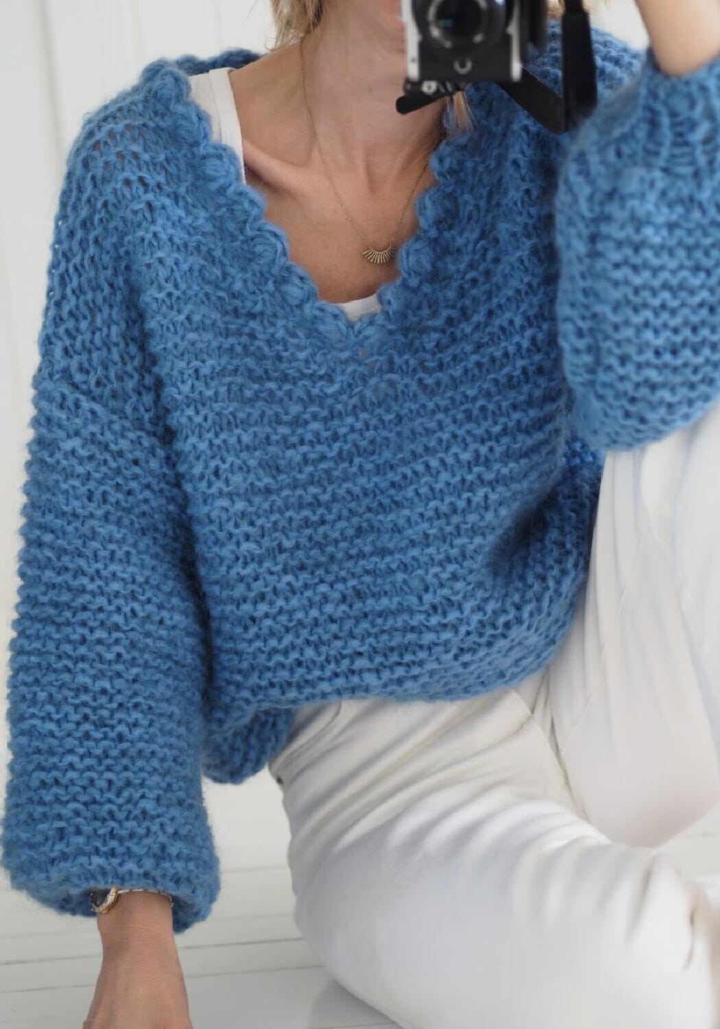 «Kaya genser» er en kjappstrikket genser på tykke pinner. En enkel genser de fleste klarer å strikke, om en behersker rette masker. V-halsen har heklede bobler som detaljer, som gjør det lille ekstra. Du kan fint justere lengden på genseren selv, men da må også garnmengden justeres.