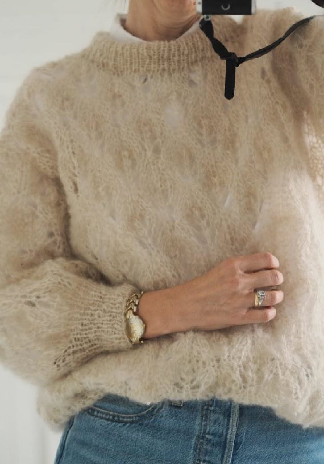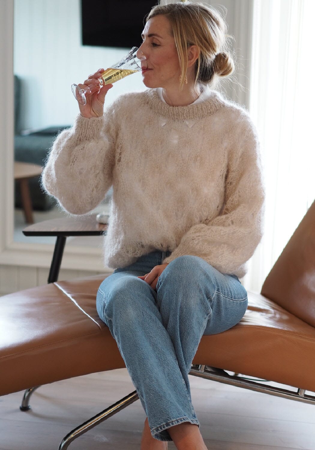 En lekker genser i nydelig hullmønster designet av Tove Lindtein. Den strikkes med en tråd Ingenua mohair på pinne nr. 8 så den blir luftig og lett.