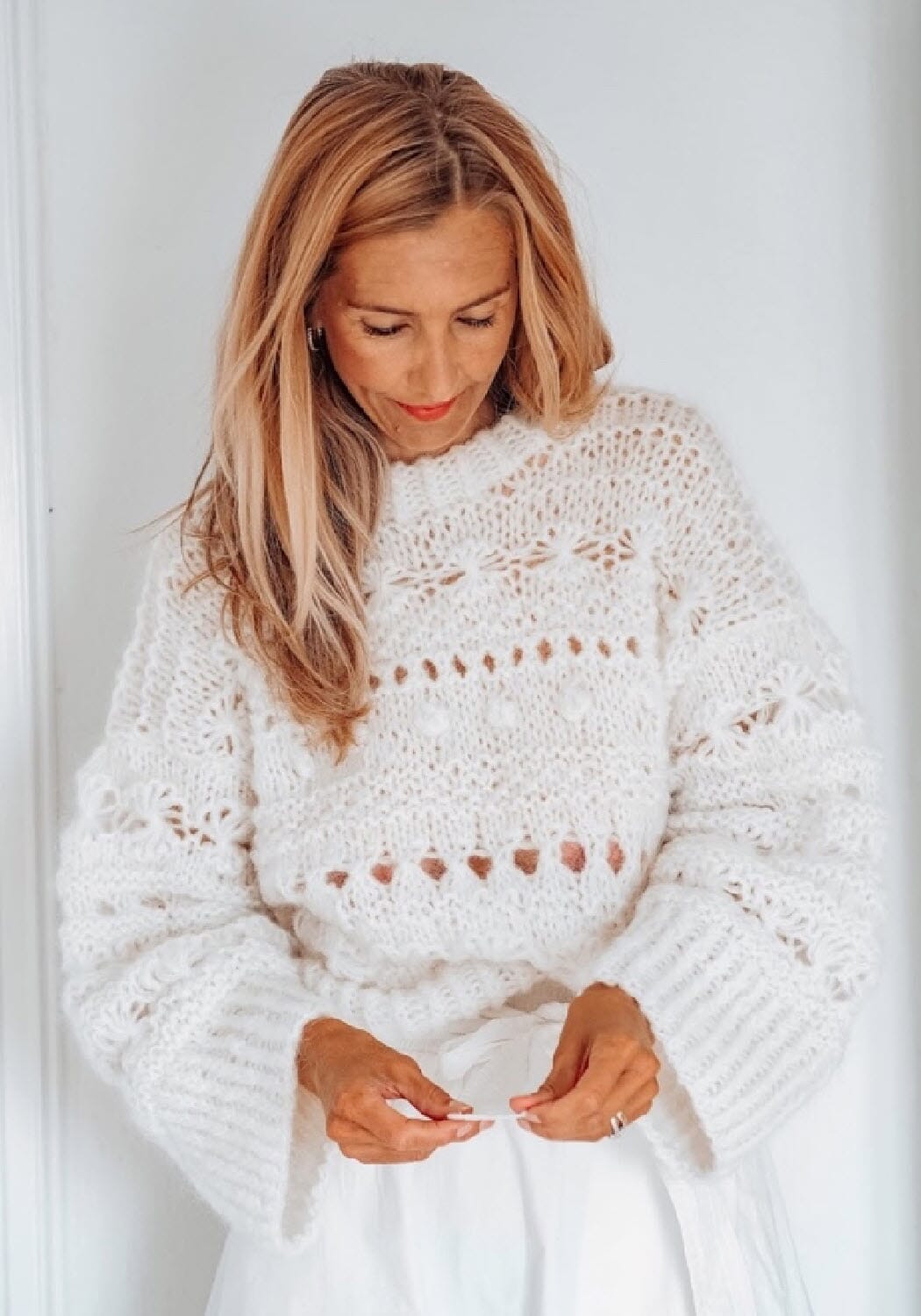 Sjekk mål for din størrelse. Her er det brukt teknikker fra den populære Lindtein genseren. Genseren kan lett forlenges, da må garnmengden justeres.