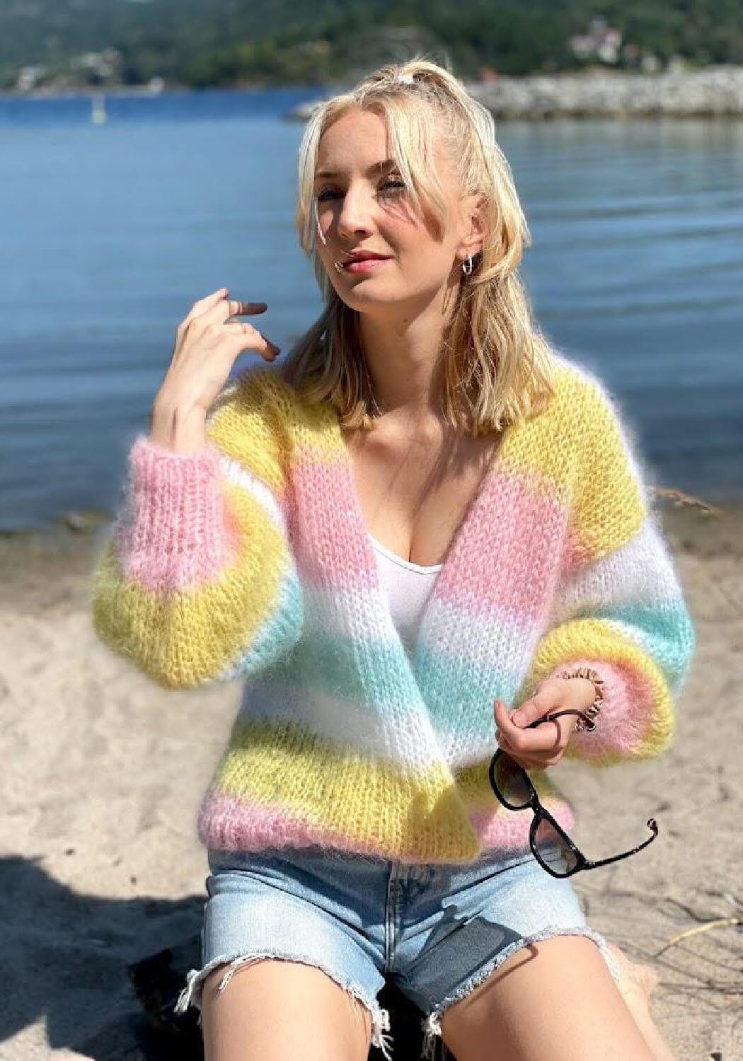 «Lykke jakke» er en kjappstrikket jakke med liten v-hals i glade spreke farger på tykke pinner. Her er det heller nesten ingen trådfestinger! Lett og myk strikk som er laget i et fantastisk mohair og ullgarn. Her kan du strikke deg en enkel jakke i dine «lykke» farger. Det er så vanvittig mange farger å velge i. Sjekk målene, jakken kan fint forlenges etter ønske, men da må også garnmengden justeres.