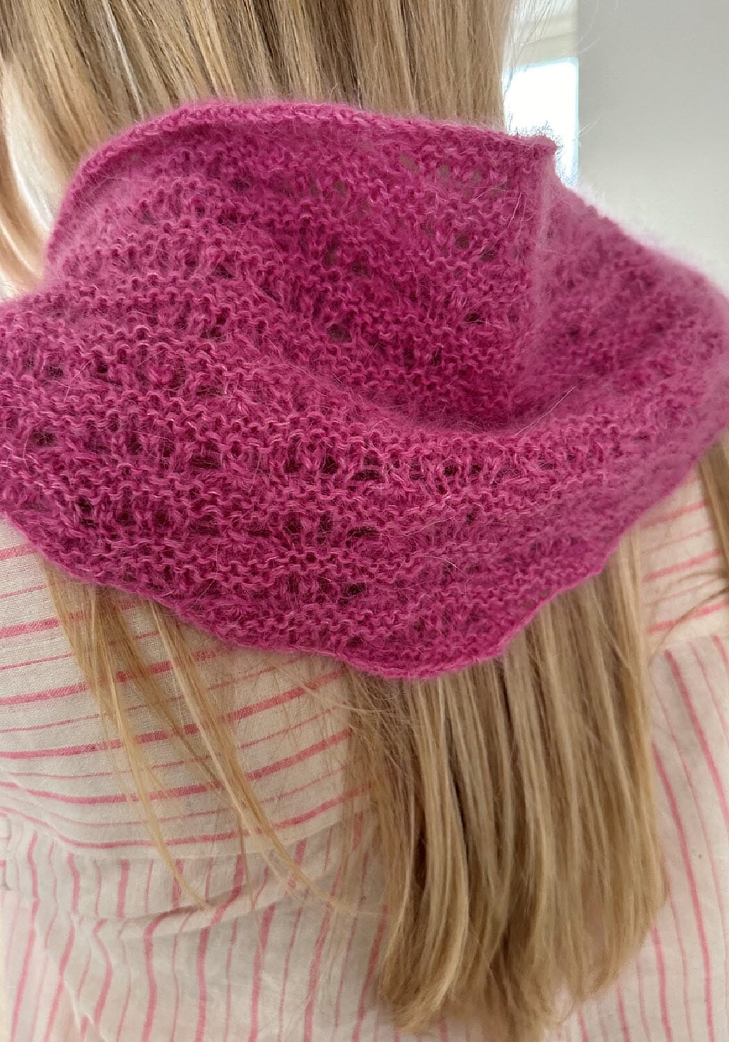 Peacock Scarf har et lite påfuglhullmønster, som får sidene på det trekantede tørkledet til å bølge lett. Da man begynner i spissen, kan Peacock Scarf strikkes i nøyaktig den størrelsen, du har bruk for – eller så langt garnet rekker.