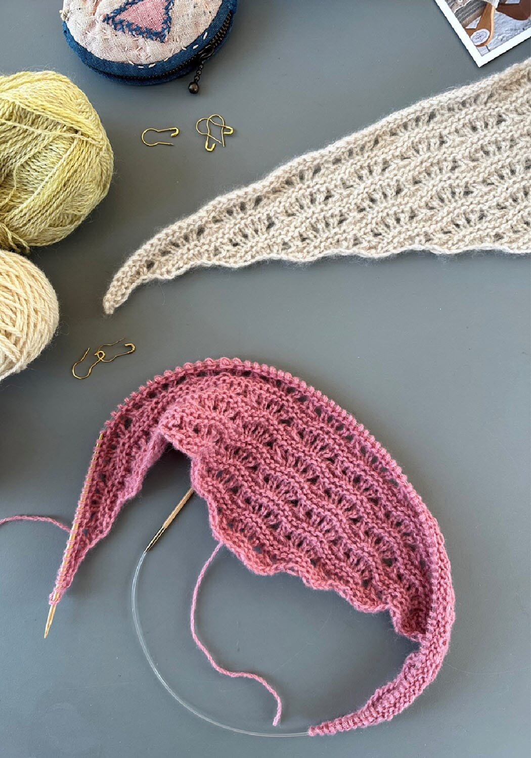 Man begynner i skjerfets spiss. Videre strikker man frem og tilbake på rundpinnen med mønster etter diagrammet (eller teksten). Det økes automatisk i hver side, når man følger diagrammet (eller teksten). Dvs. det blir automatisk flere og flere masker.