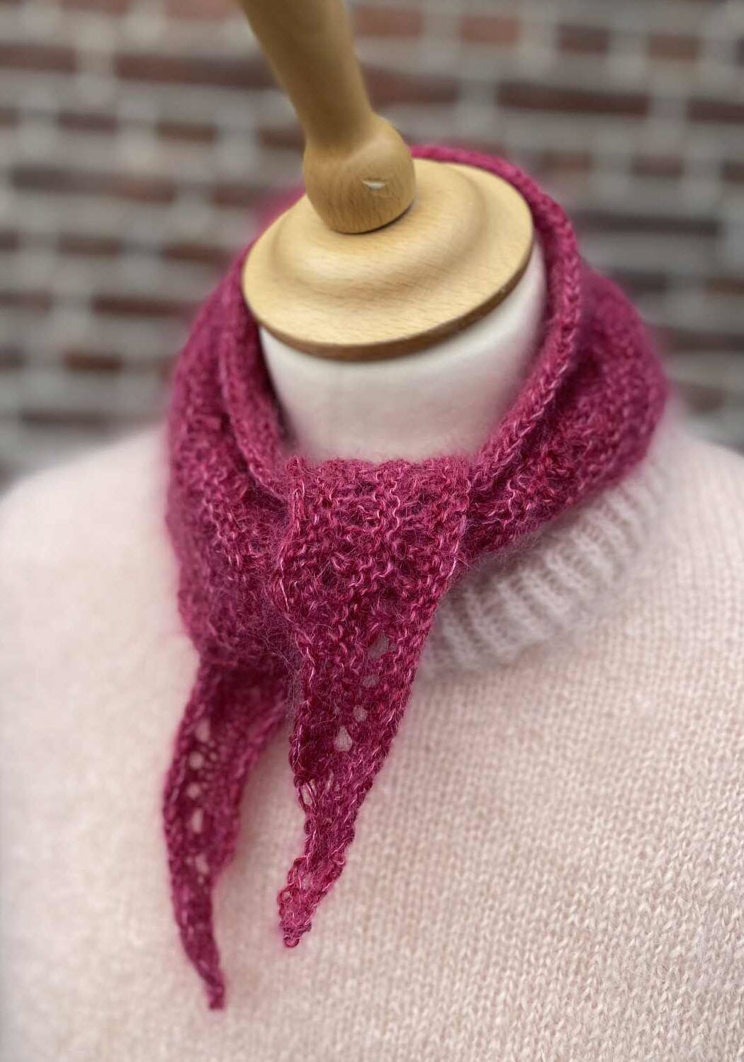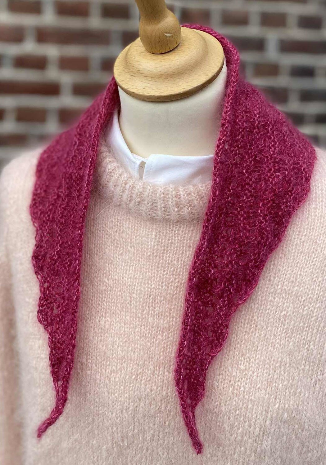 Peacock Scarf har et lite påfuglhullmønster, som får sidene på det trekantede tørkledet til å bølge lett. Da man begynner i spissen, kan Peacock Scarf strikkes i nøyaktig den størrelsen, du har bruk for – eller så langt garnet rekker.