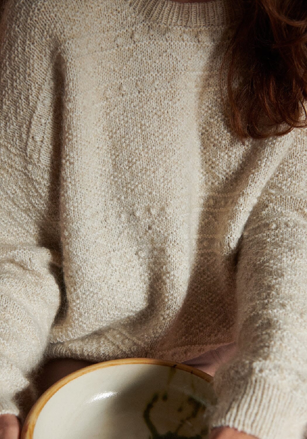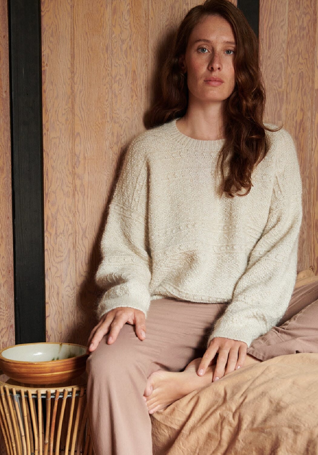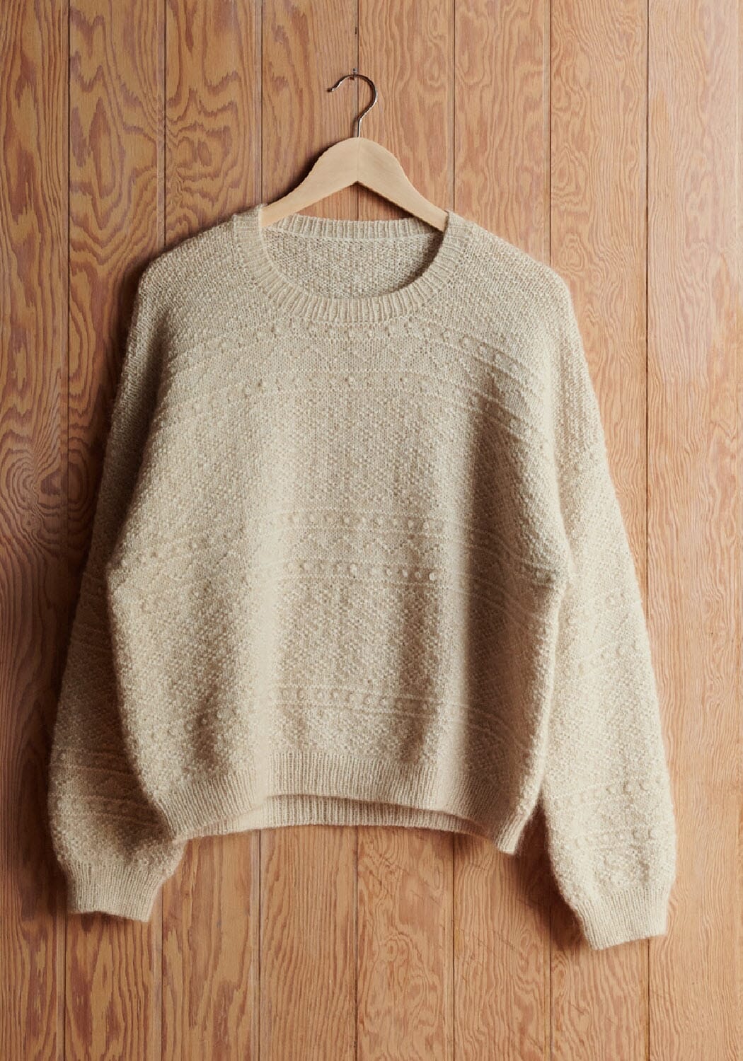 Rett- og vrangmasker kombineres på fineste vis i Peggy sweater, som har drop shoulder og et boxy snitt. Mønstrene er enkle og sitter raskt i fingrene. Om du trenger å se hvordan de nye maskene integreres i mønsteret, finner du diagrammer til alle trinn i oppskriften.