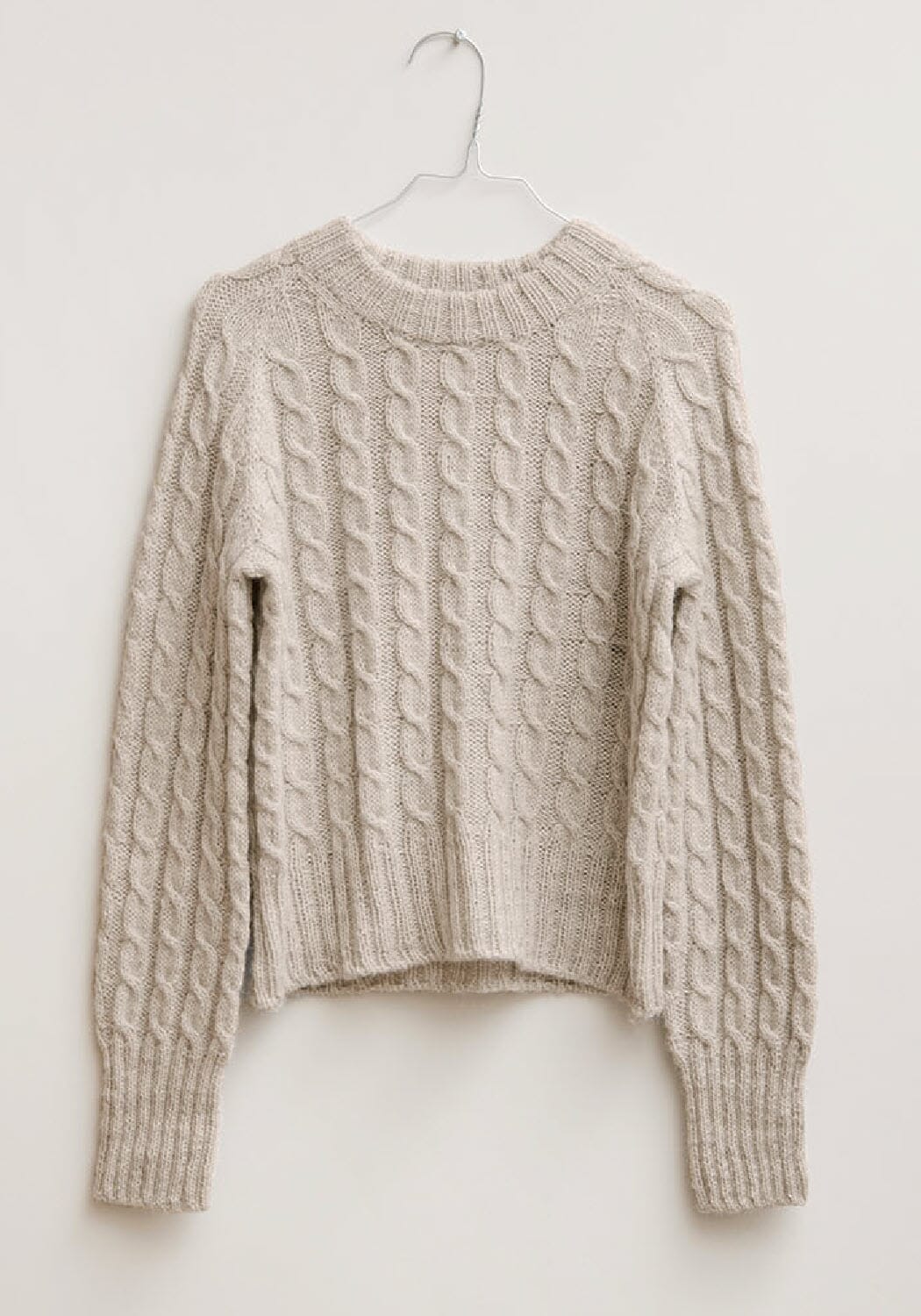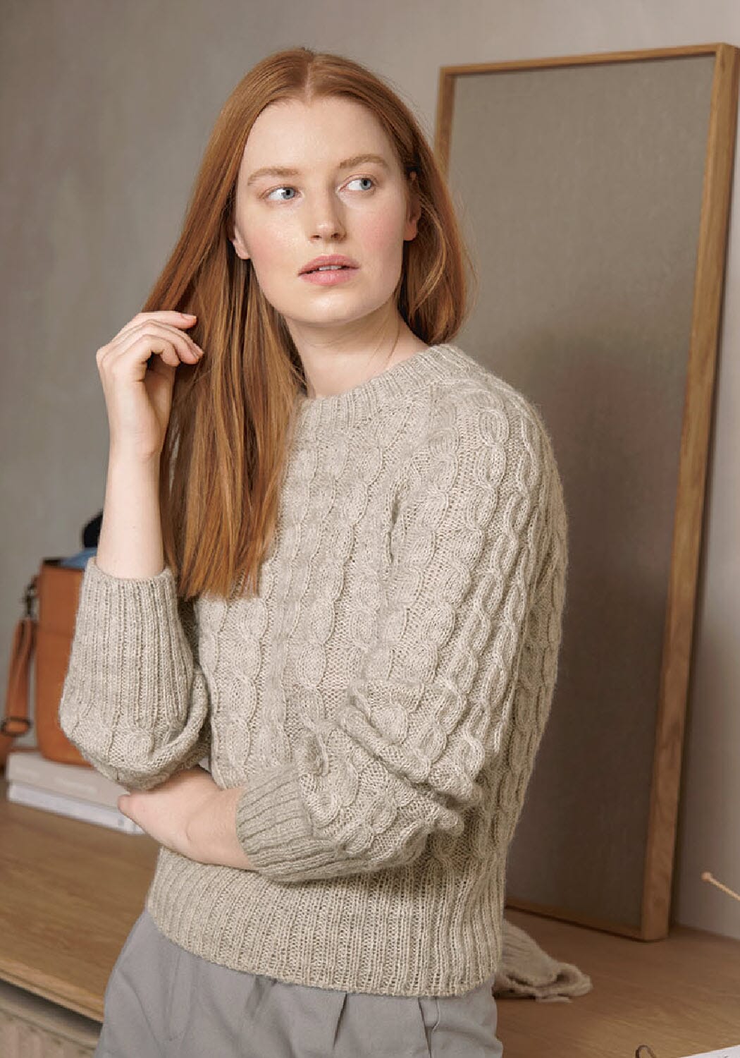 Først legger du opp masker til ermer og bakstykket, videre økes det til hals og raglan, samtidig som det strikkes diagram med flettevridninger. Arbeidet deles til ermer, for- og bakstykke. For- og bakstykket strikkes rundt med flettevridninger før det avsluttes med vrangbord. Det samme gjøres med ermene. Halskanten strikkes til slutt i vrangbord og brettes dobbel mot vrangsiden. Hele genseren strikkes med 1 tråd av hver kvalitet.