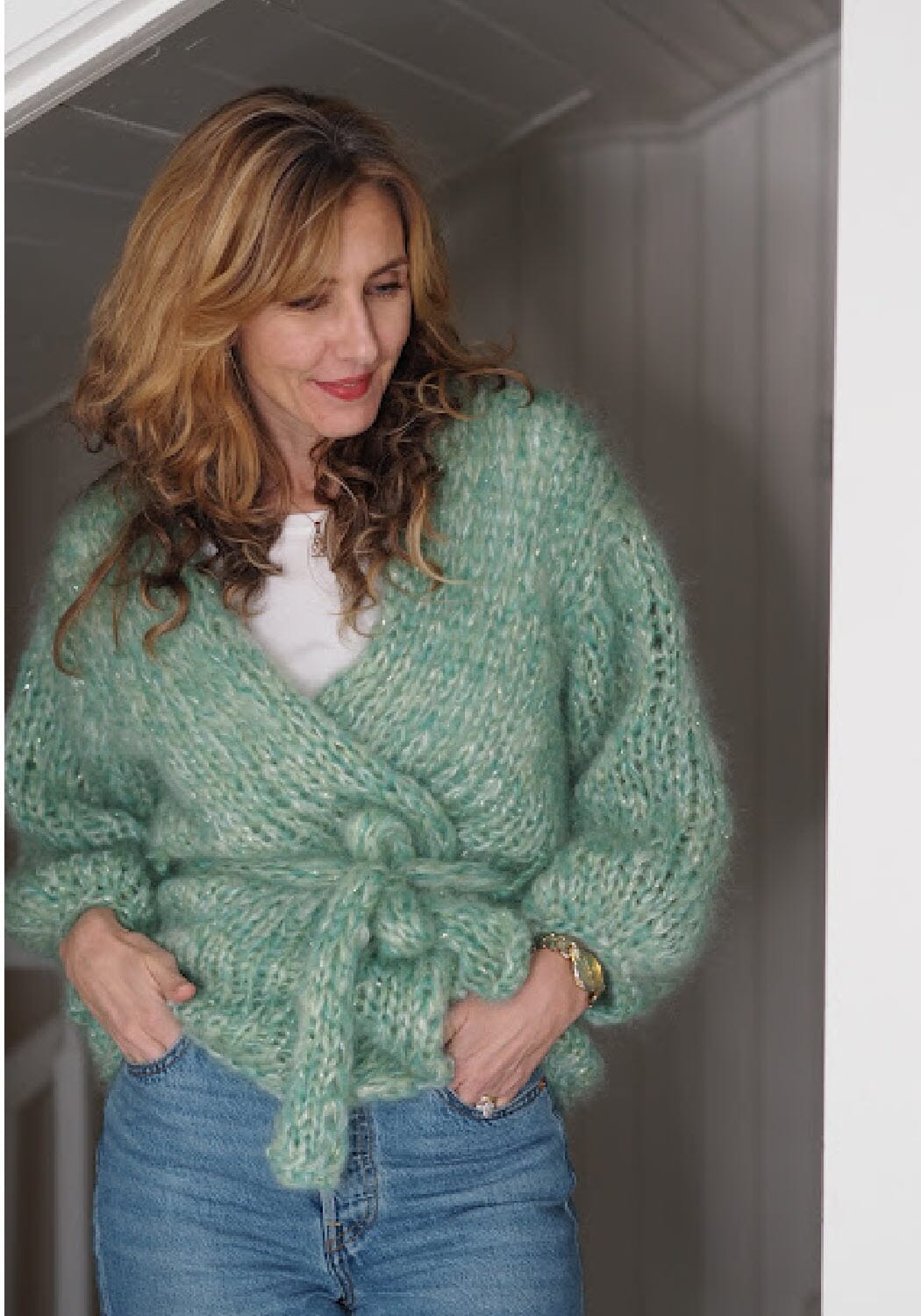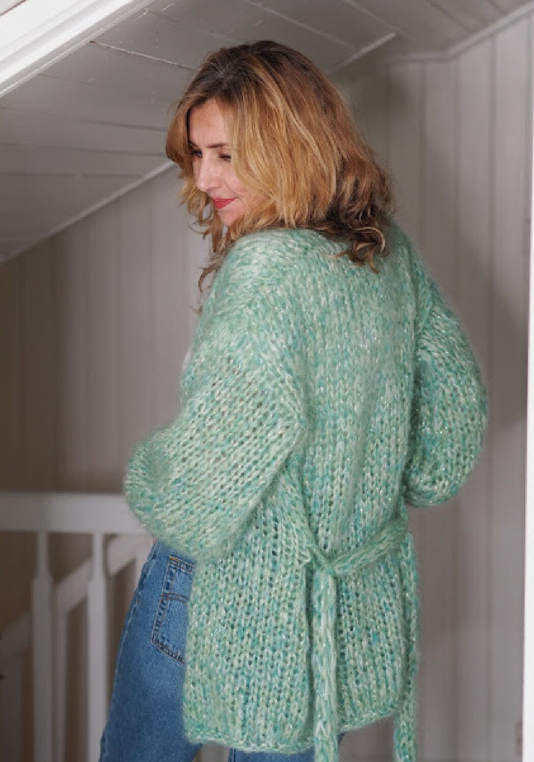 «Tindra Jakke» er en kjappstrikket myk jakke med knytebelte i livet. Jakken strikkes med 3 tråder mohair og 2 tråder med glittertråd. Her kan du strikke deg en enkel jakke du kan bruke til alt i garderoben. Kan brukes både åpen og lukket. Jakken kan fint forlenges, men da må garnmengden økes.