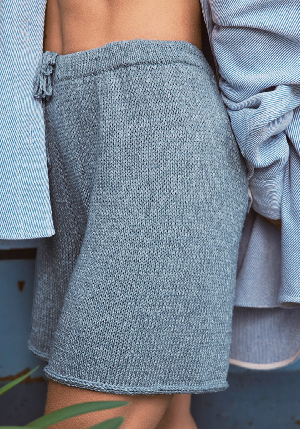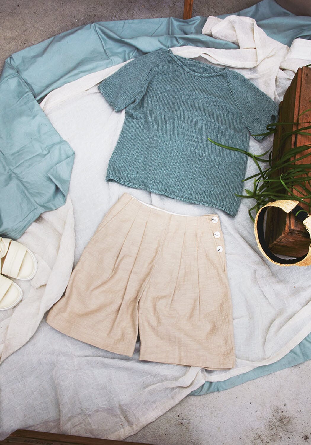 Tiril har i samarbeid med Sandnes Garn laget en perfekt avslappet strikket shorts med enten en t-skjorte eller langermet genser til. Oppskriftsheftet inneholder oppskrifter på alle de tre modellene. Her står man fritt til å kombinere farger på lik linje som lang eller kortermet. Shortsen kan sitte både høyt og lavt i livet, og liker du ikke snøring kan du alltids putte inn en strikk. Plaggene strikkes ovenfra og ned i glattstrikk i Line, som er et garn laget av både lin, viscose og bomull.