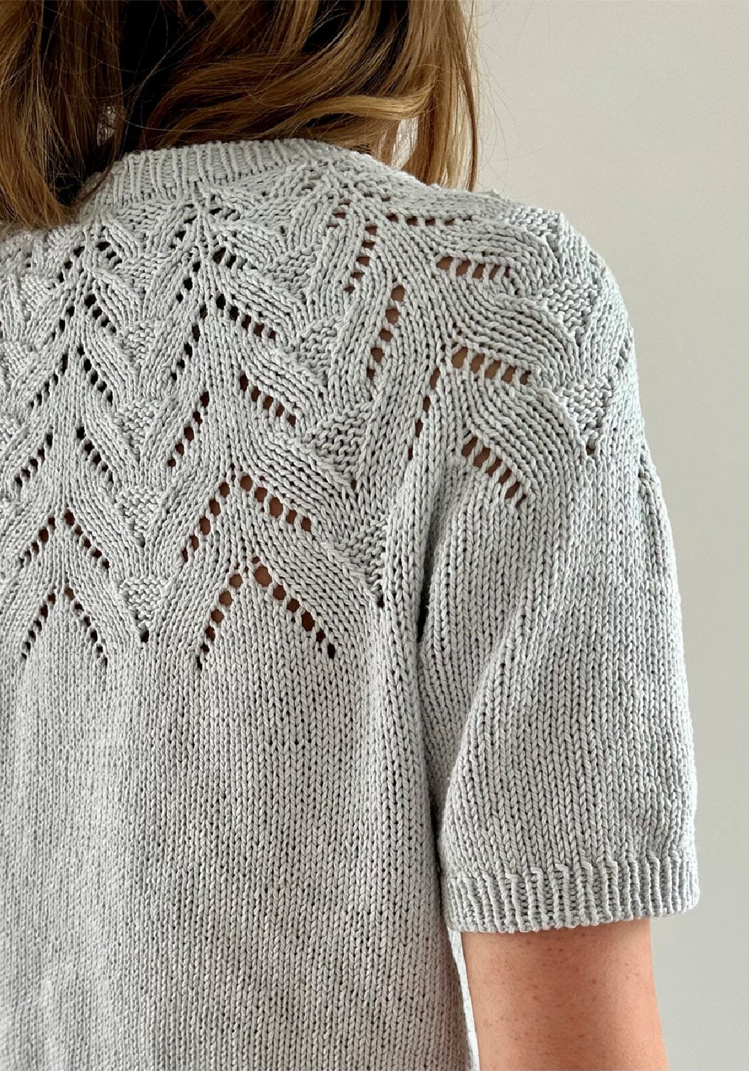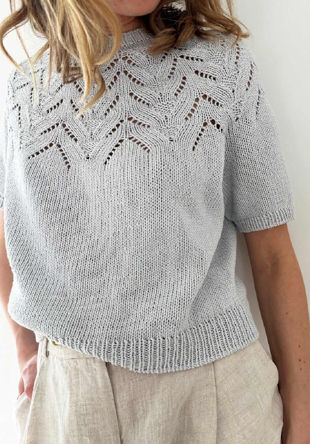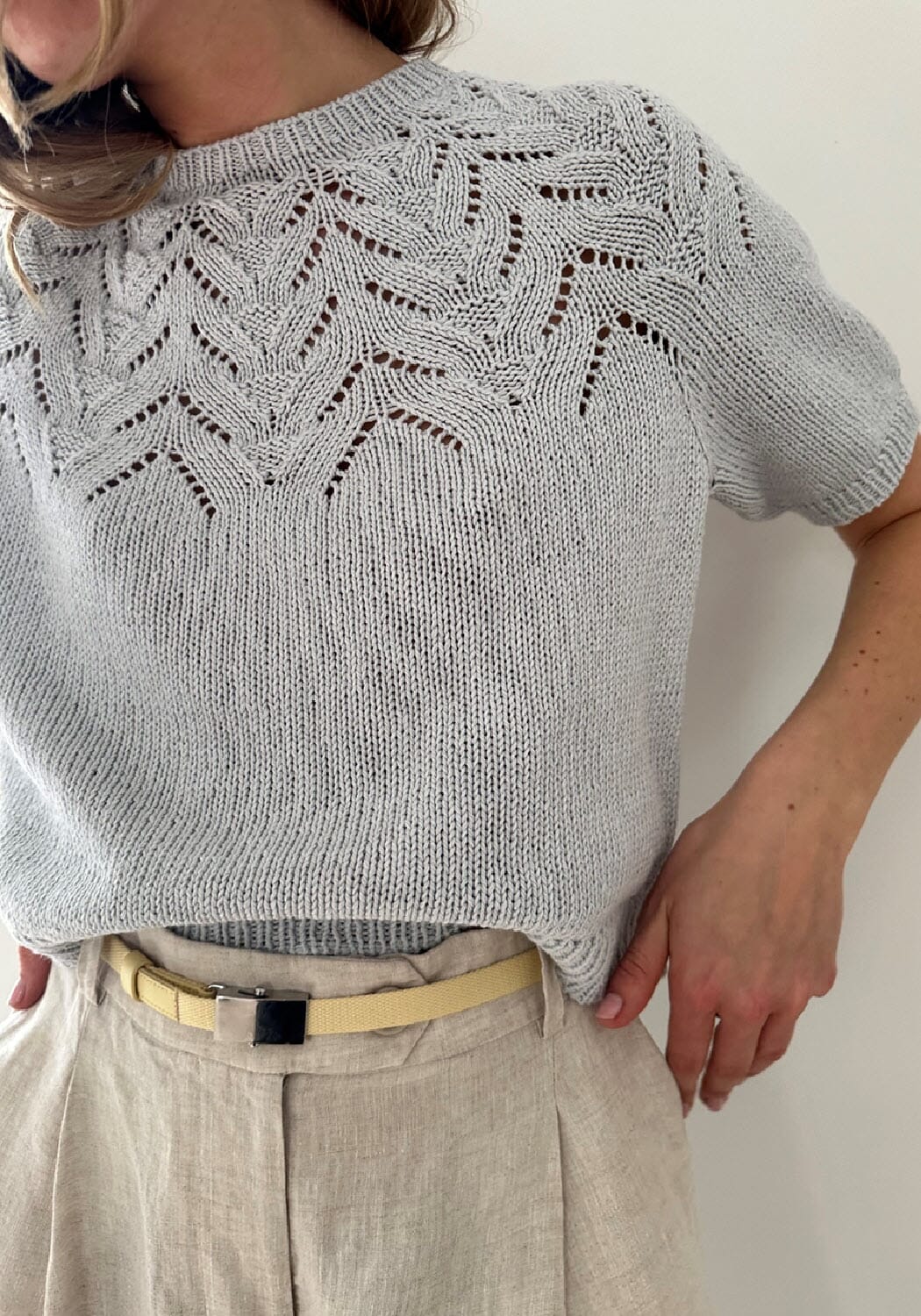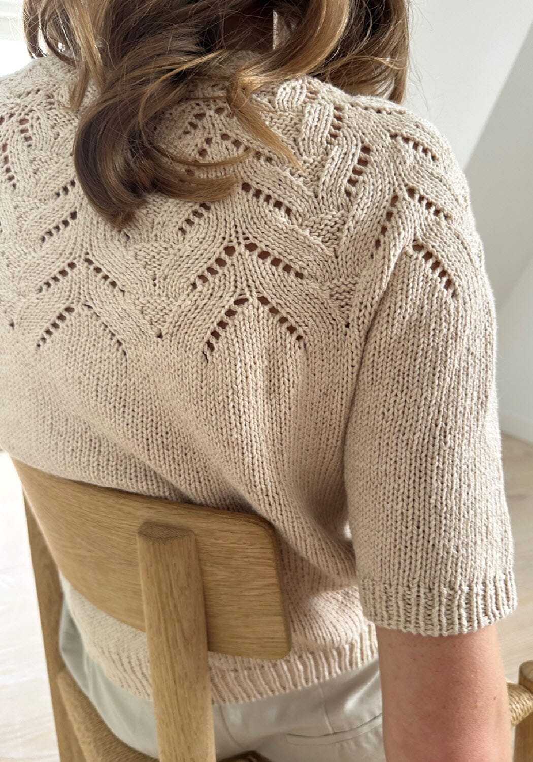 Tulipan Tee strikkes ovenfra og ned og halsutringningen formes ved hjelp av vendepinner som strikkes etter halskanten. Bærestykkets mønster består av enkle kombinasjoner av hullmønster og vrangmasker, som til sammen gir en grafisk struktur. Mønsteret og fasongen på bærestykket dannes automatisk når du følger diagrammet.