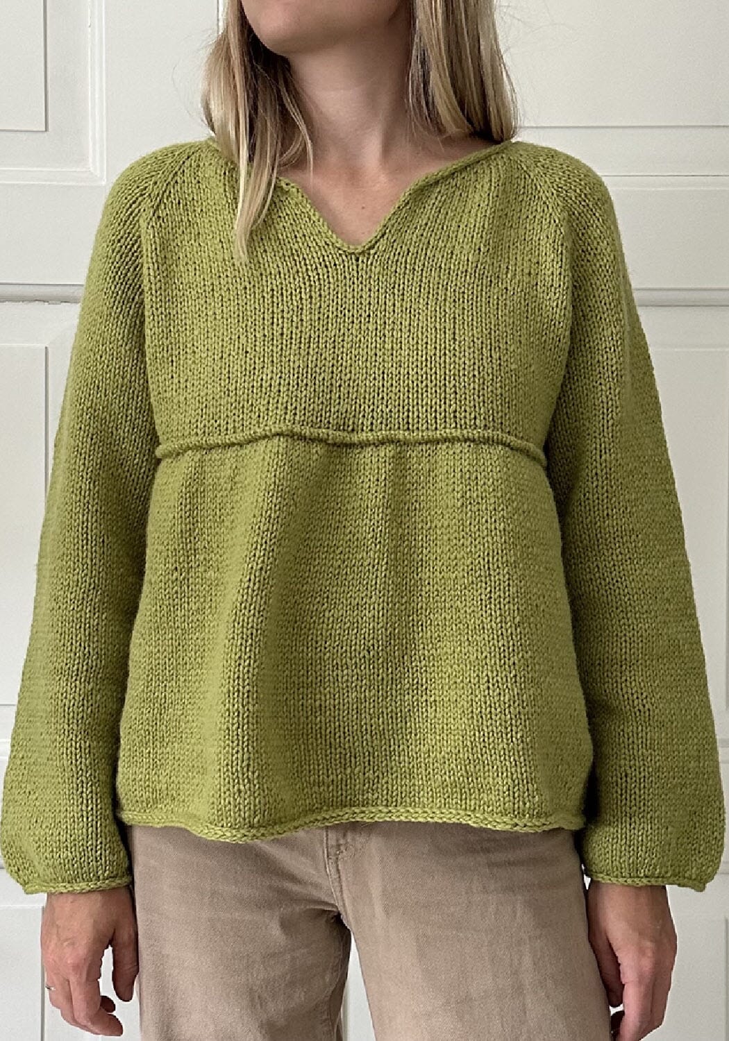 Spirebluse strikkes ovenfra og ned med en tilpasset raglanøkning med en liten splitt foran.