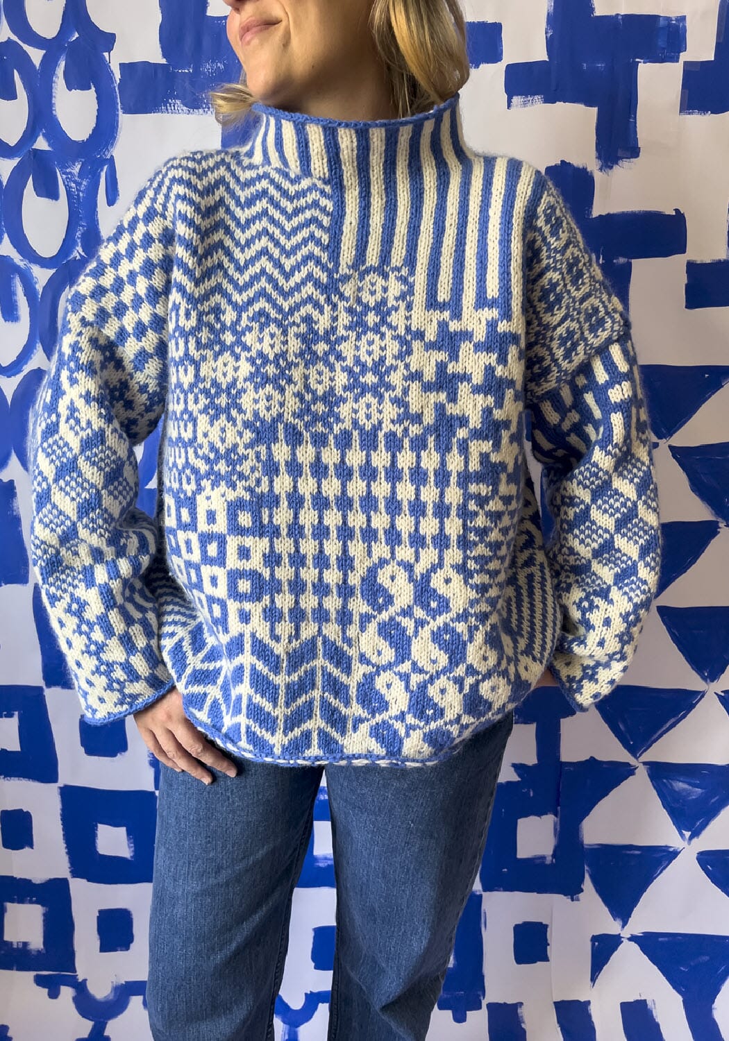Boxy sweater med patchwork av tradisjonelle nordiske mønstre.