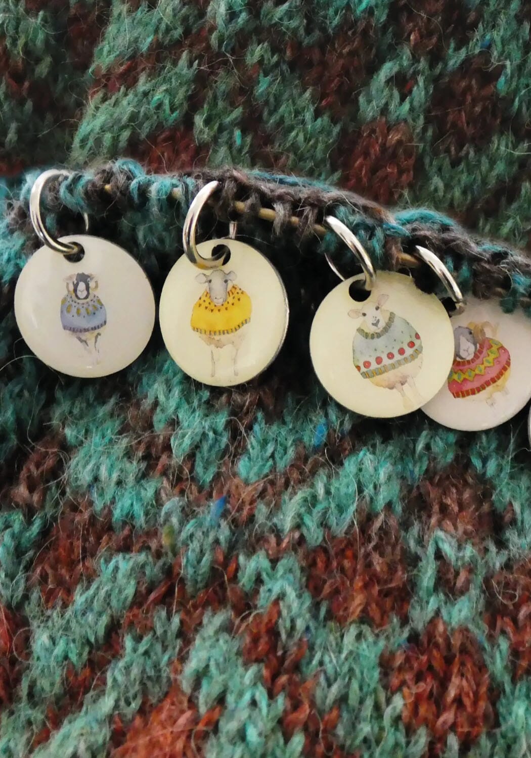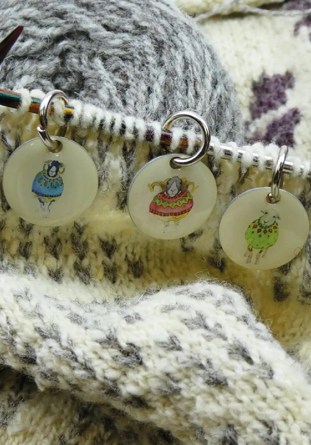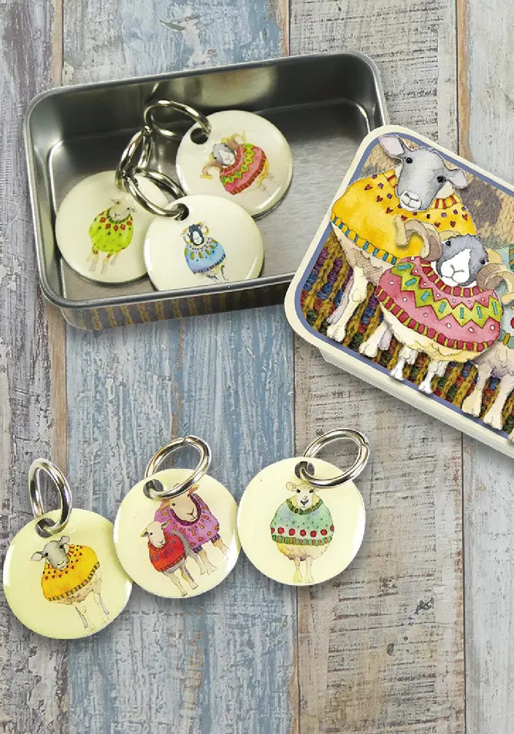 6 stk. søte maskemarkører med motiver av sauer i fargerike gensere. Maskemarkørene brukes på strikkepinnen og passer på strikkepinner tom. 8 mm. Maskemarkørene kommer i metallboks med skyvelokk med sauemotiv.