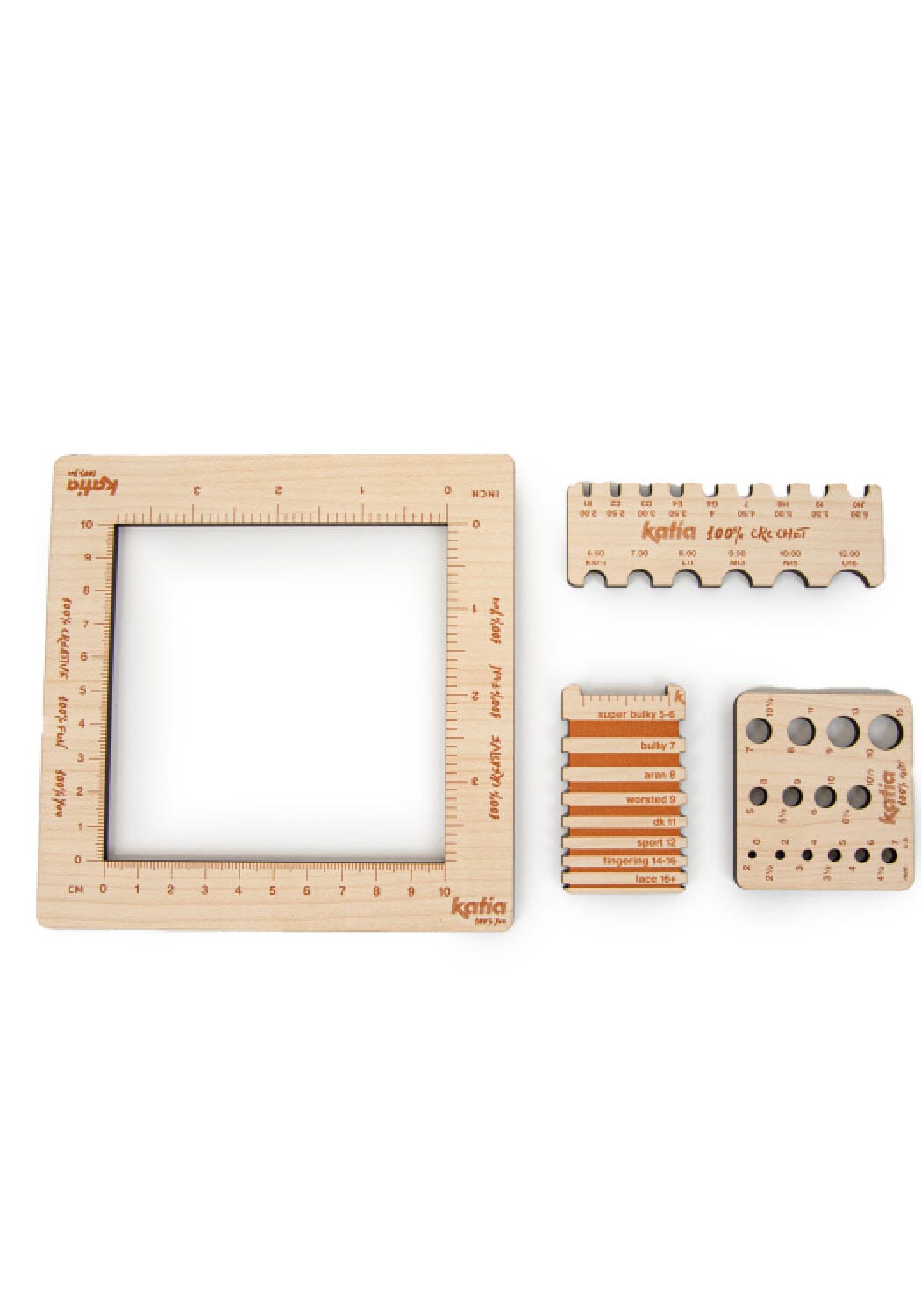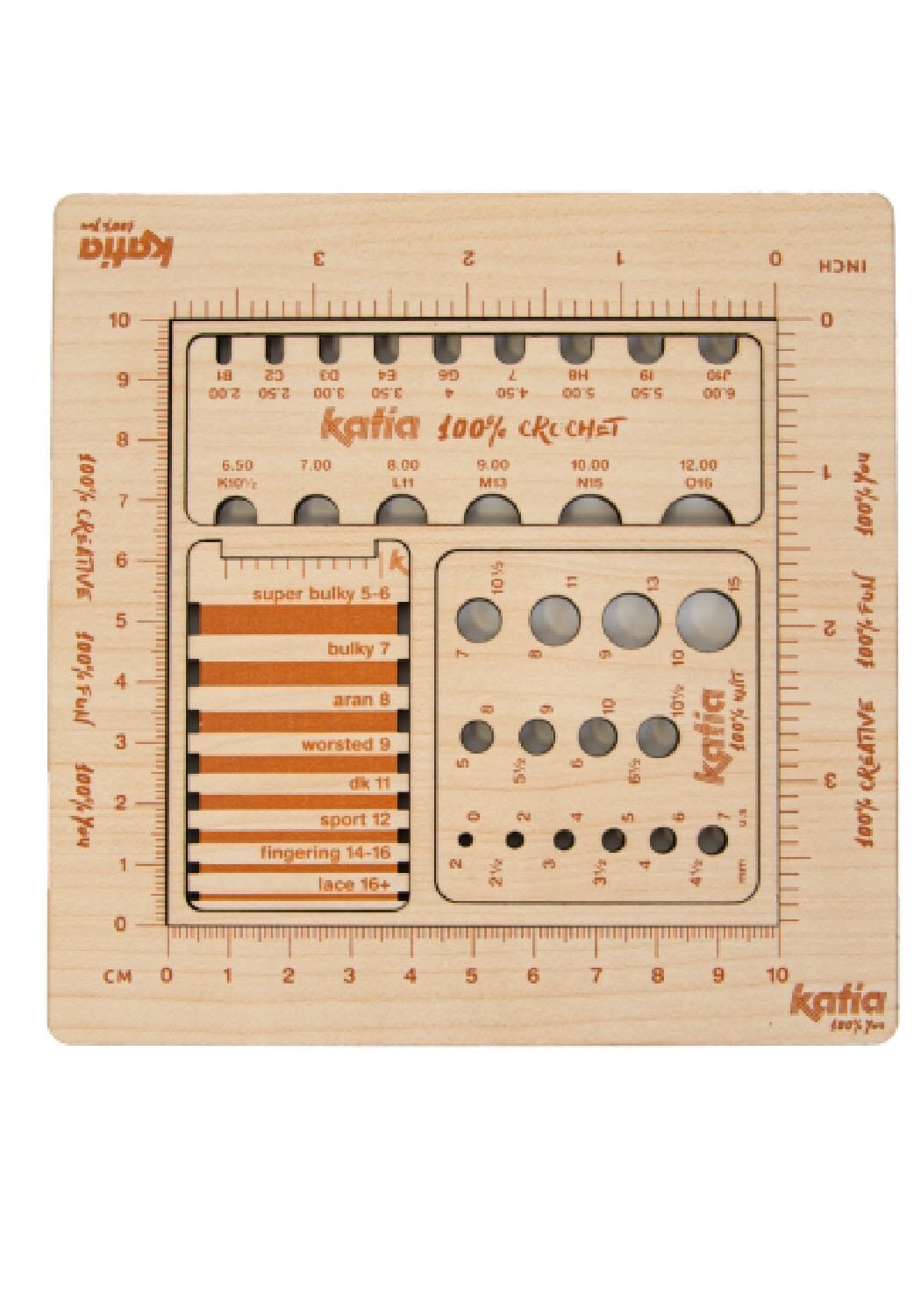 Pinnemåleren som har alt! Her kan du måle pinnetykkelser fra 2-10 mm, heklenåltykkelser fra 2-12 mm (ja, det er en egen måler for heklenåler pga kroken :-). Du får også en ramme på 10 x 10 cm til å måle strikkefasthet, samt linjal med centimeter og tommer. I tillegg er det en egen trådmåler som er kjekk hvis du strikker engelske oppskrifter som gjerne har egne betegnelser på garnet -som bulky, worsted og lace.