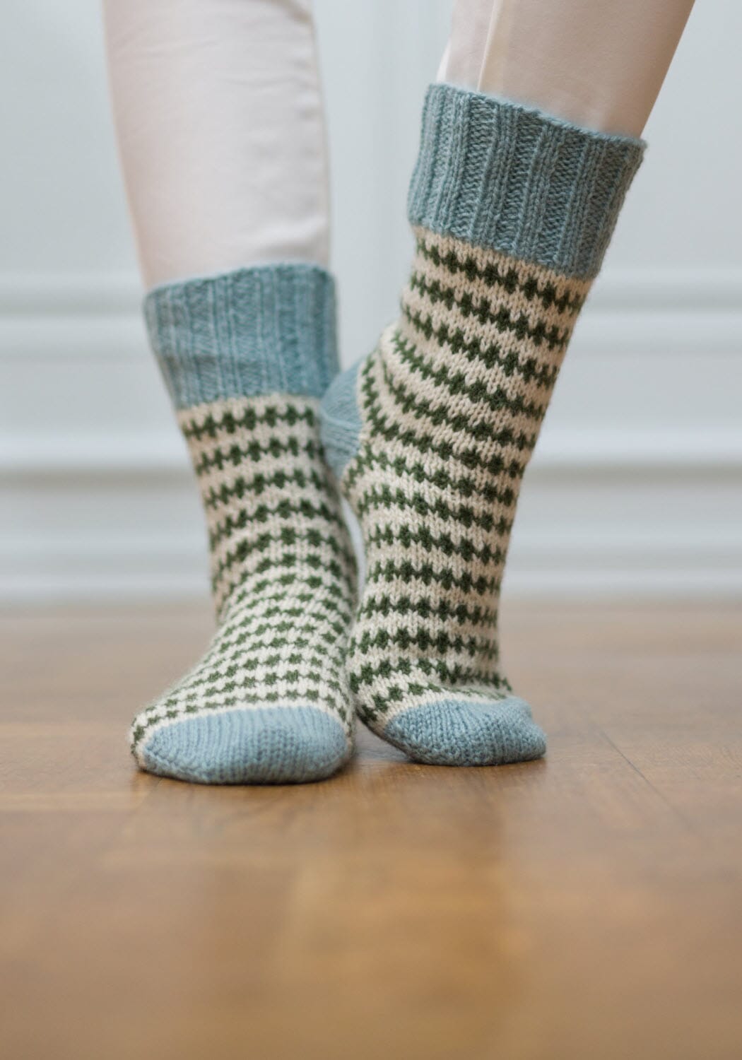 Heim sokker strikkes i Fjord sokkegarn 2 fra Hillesvåg Ullvarefabrikk. Garnpakken inneholder oppskrift og garn nok til største størrelse.